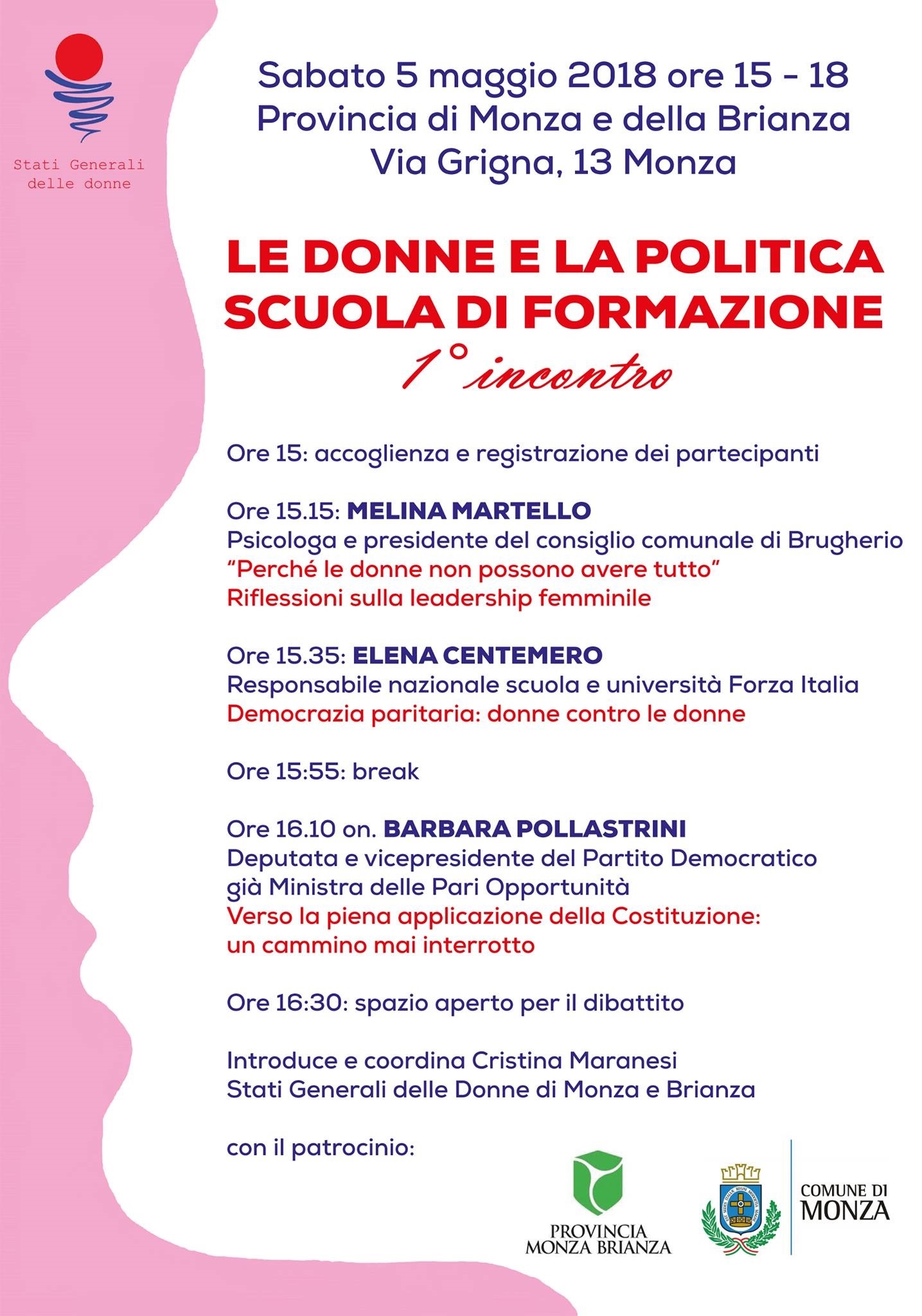 " Le donne e la politica, scuola di formazione" è il primo incontro promosso dal Tavolo " Scuola di formazione politica delle donne" degli Stati Generali delle Donne, sezione Monza e Brianza e patrocinato dalla Provincia di Monza e della Brianza e dal Comune di Monza, che si propone di affrontare il tema della leadership femminile e degli ostacoli che ancora allontanano le donne dalla politica o, se presenti, le relegano nelle retrovie.